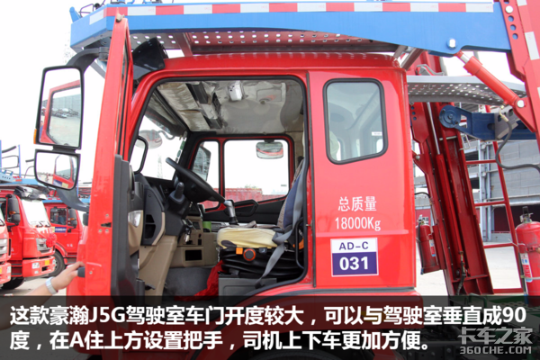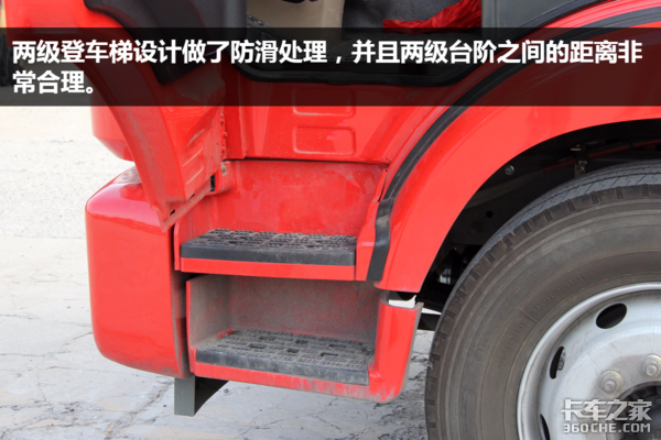 这款豪瀚J5G驾驶室车门开度较大,可以与驾驶室垂直成90度,在A柱上方设置把手,司机上下车更加方便。两级登车梯设计做了防滑处理,并且两级台阶之间的距离非常合理。