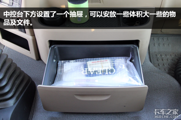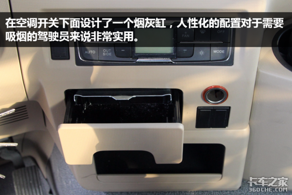 虽然驾驶室的高度降低之后,牺牲了一些原本驾驶室顶部的储存空间,但是在中控台下方设置了一个抽屉,可以安放一些体积大一些的物品及文件。并且还在空调开关下面设计了一个烟灰缸,人性化的配置对于需要吸烟的驾驶员来说非常实用。
