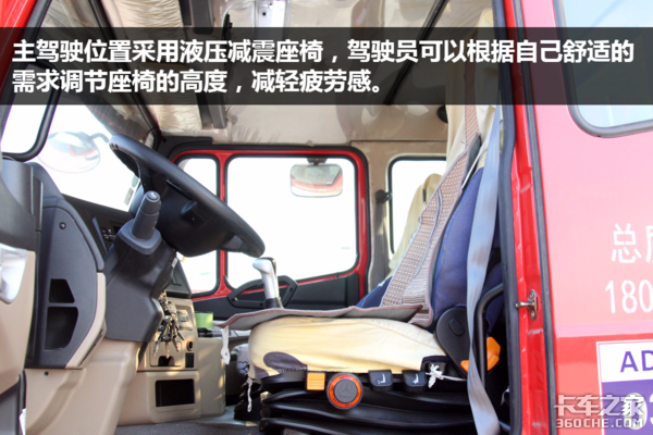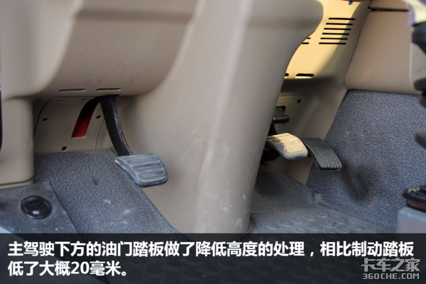主驾驶下方的油门踏板做了降低高度的处理,相比制动踏板低了大概20毫米,长途驾驶可以使司机操作更加舒适。主驾驶位置采用液压减震座椅,驾驶员可以根据自己舒适的需求调节座椅的高度,减轻疲劳感。