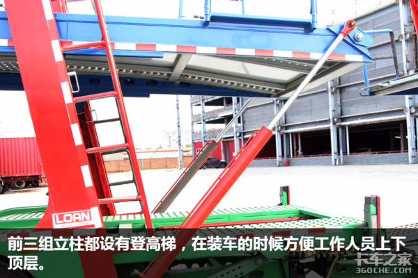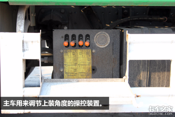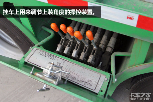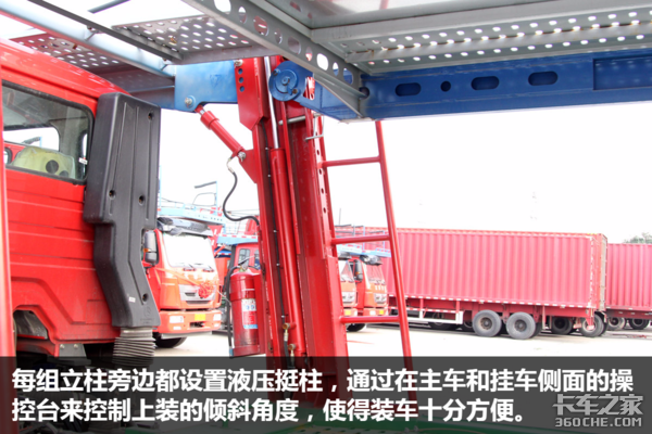 与市场上其它很多中置轴挂车不同的是,重汽J5G这款轿运车的上装,在每组立柱旁边都设置液压挺柱,通过在主车和挂车侧面的操控台来控制上装的倾斜角度,使得装车十分方便。