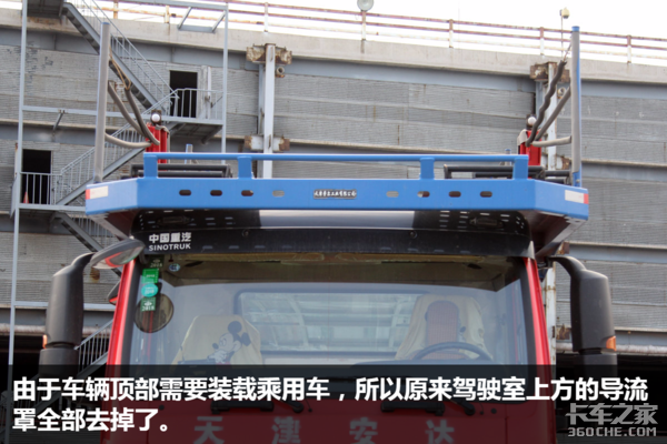 外观方面,相较于以往豪瀚牵引车有所改变,但仍然保留家族式大气、简约的设计风格,大红色涂装设计看上去极具视觉冲击力。由于车辆顶部需要装载乘用车,所以原来驾驶室上方的导流罩全部去掉了。