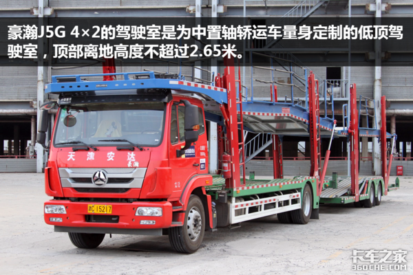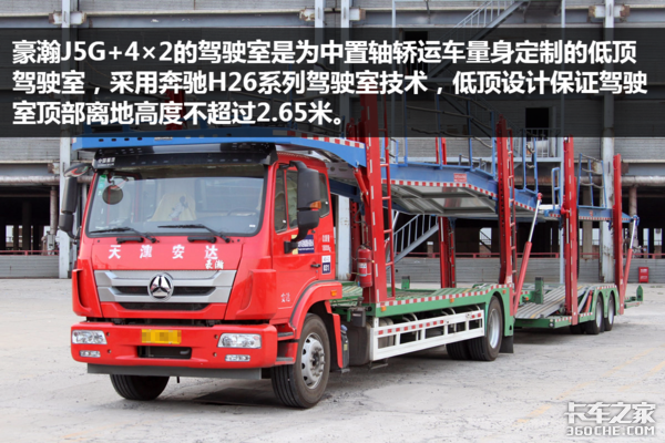 这款豪瀚J5G 4×2的驾驶室是为中置轴轿运车量身定制的低顶驾驶室,采用奔驰H26系列驾驶室技术,低顶设计保证驾驶室顶部离地高度不超过2.65米,有效降低整车高度,为上方装载预留更多可用空间,使用的范围更广。