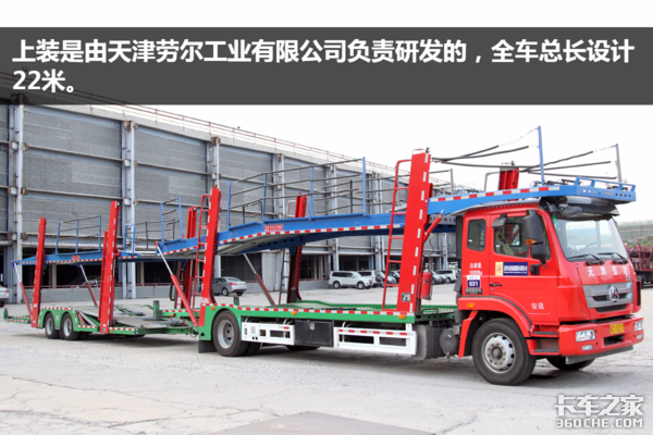 该车上装是由天津劳尔工业有限公司负责研发的,列车总长设计22米,其中主车为12米,车宽为2.55米,可以运输8-10辆商品车,运力比市场上符合标准的轿运车更强。