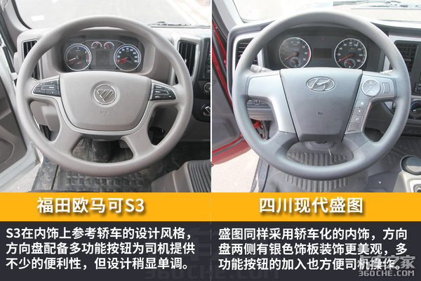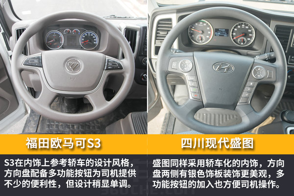 四川现代盛图和欧马可S3比较下来,单论外观方面,欧马可S3确实比较惊艳,能吸引一批颜值派的目光,而盛图则是相对稳重,细看才能感受它的内涵。而从驾驶室内外总体来看,欧马可S3则是外强里面平淡,S3的内饰水平不如外观来得经验漂亮。但盛图不一样,盛图给我的感觉是属于那种内外兼修的车型,无论是外观还是内饰,都让人满意,同时盛图在驾驶室舒适性、人性化方面也考虑的非常周到。(图/李岩 文/陈锋传)