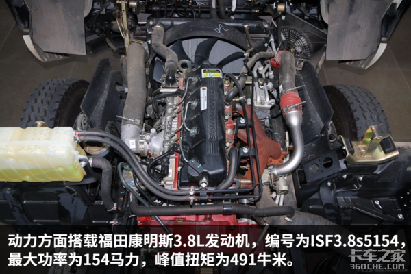 动力方面搭载福田康明斯3.8L发动机,编号为ISF3.8s5154,这台机器采用的是博世高压共轨、SCR后处理技术达到国五排放的。相比于国四时期,这款机器的排放、动力均得到了提升。