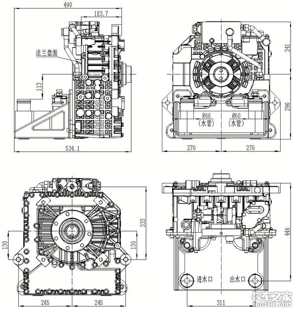 通过外形图和安装图我们得知,串联式液力缓速器等于在变速箱尾部又增加了一截,需要变速箱尾端安装平面距离变速箱后方的横梁有足够的空间,但是对宽度空间要求不高,无论是单节传动轴还是多节传动轴均可采用这种形式的缓速器。