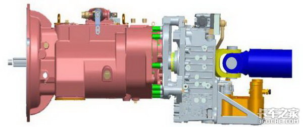 并联式液力缓速器,顾名思义它的安装形式是与传动轴并联。安装效果如下图所示,液力缓速器总成安装于传动轴旁边的副箱后盖上。