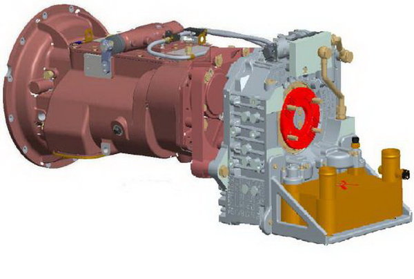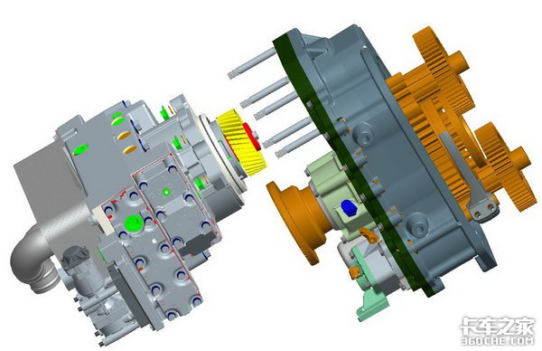拆下黄色的挡板,液力缓速器直接安装于黄色的挡板处,以双头螺柱与副箱后壳连接即可。