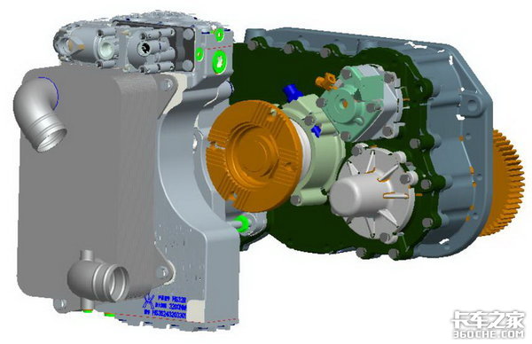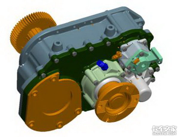 安装完成示意图,细心的卡友可能已经发现,普通的变速箱副箱并没有靠近后盖的那一对斜齿齿轮,也就是说,普通变速箱想要安装并联式液力缓速器需要更换掉差不多整个副箱才能实现。