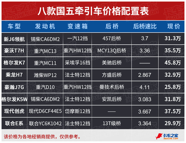 在最近这段时间共有八款牵引车正在进行促销活动,分别是解放J6P、豪沃T7H、格尔发K7、乘龙H7、豪瀚J7G、格尔发K5、现代创虎Xcient、联合E系。