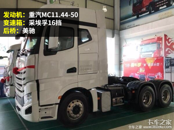 重汽MC13发动机搭配重汽HW12挡变速箱与小速比MCY13Q后桥,当变速箱在最高挡位,发动机转速为1200转时,车辆时速能达到93Km/h左右。如果有卡友对该车比较感兴趣的话,可点击以下链接了解促销详情:武汉HOWOT7H牵引车促销中。
