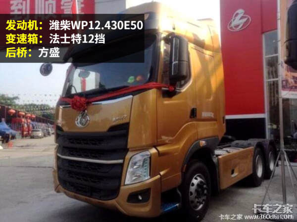 在底盘配置方面,该车搭载潍柴WP12.430E50发动机,最大输出430马力,最大扭矩2060牛米,满足国五排放标准。与之相匹配的是法士特12挡变速箱,后桥采用方盛后桥,速比2.867。