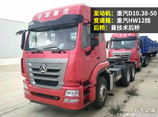 重汽D10发动机搭配重汽HW12挡变速箱与4.11曼技术后桥,当变速箱在最高挡位,发动机转速为1200转时,车辆时速能达到76Km/h左右。如果有卡友对该车比较感兴趣的话,可点击以下链接了解促销详情:济南豪瀚J7G牵引车促销中。
