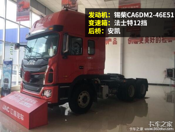 锡柴奥威11L发动机搭配法士特12挡变速箱与小速比安凯后桥,当变速箱在最高挡位,发动机转速为1200转时,车辆时速能达到79Km/h左右,也比较适合高速标载的运输工况。如果有卡友对该车比较感兴趣,可点击以下链接了解促销详情:徐州江淮格尔发K5牵引车促销。