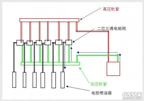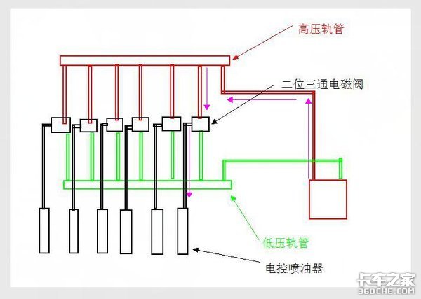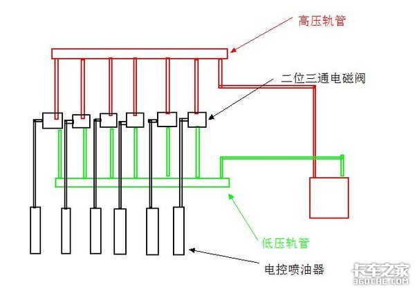 涂鸦个草图来看一下,其实两根共轨管都与这六颗喷油器相连接,两根共轨管内的轨压不同,中间经过二位三通电磁阀,也就是说,电磁阀来决定喷油器连接到哪根共轨管。