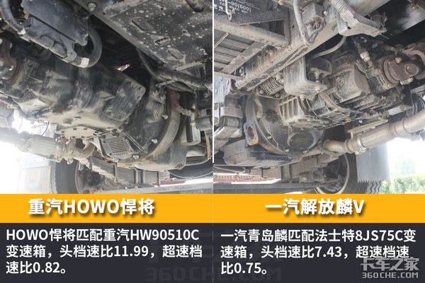 8吨级后桥铸造桥壳承载能力都不错,速比方面HOWO的后桥是4.33,麟V的后桥是4.875,由于两车的变速箱最高档速比不同,实际巡航速度并没有太大差别。