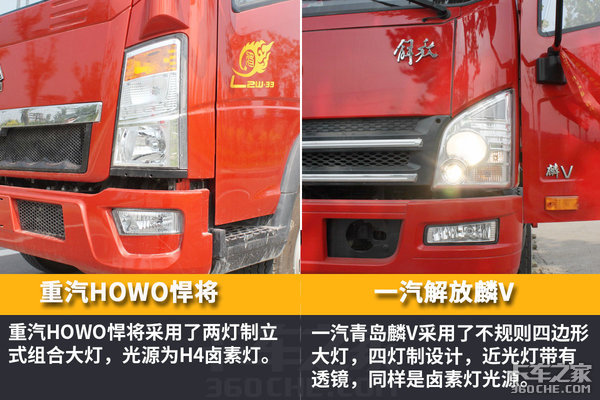 HOWO悍将的大灯为时下流行的直立式设计,H4灯泡价格便宜通用性好;而青岛解放麟V的四灯制大灯带有近光灯透镜,直接将近光灯改装为HID光源也不会散射影响对向车辆。
