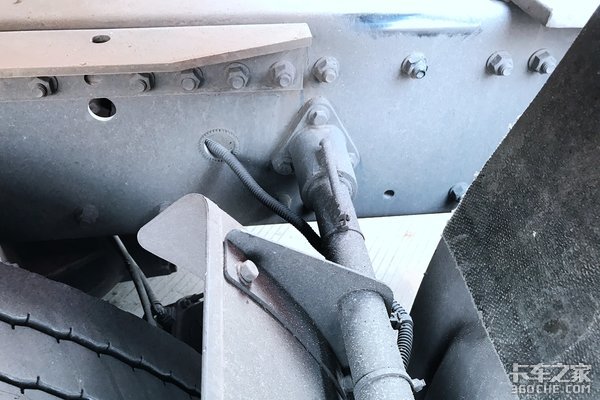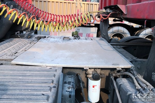 惨痛的教训让卡友在大梁上加了一块铝板,因为挂车前面有一个放雨布和捆绳的地方,有一次就是因为捆绳掉下来搅进了传动轴,导致管路被高速转动绳子拉断,后来为了避免这种事发生,所以干脆加了一个铝板上去。