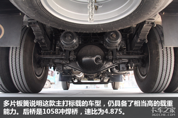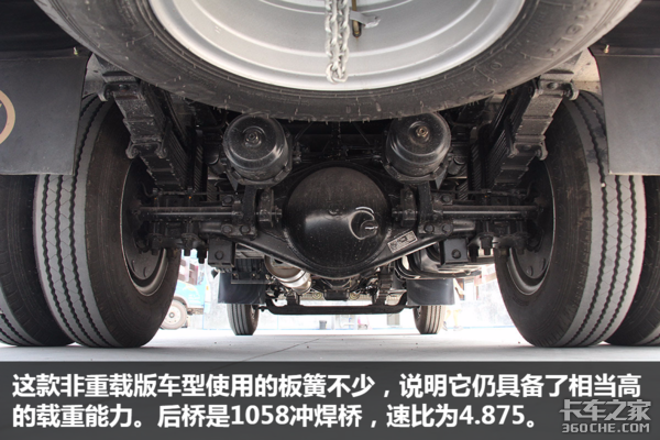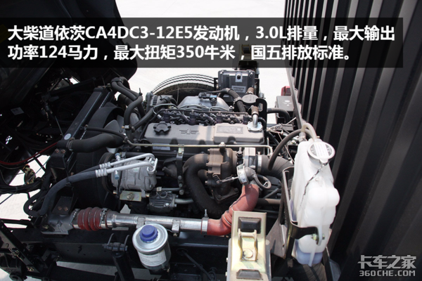 该车搭载大柴道依茨3.0L发动机,最大输出功率为124马力,最大扭矩350牛米,匹配的是5挡变速箱。在这动力之上的,当然还有康明斯3.8L发动机,配6挡变速箱(其实还有法士特8挡箱可选,适应山区重载的运输条件)。
