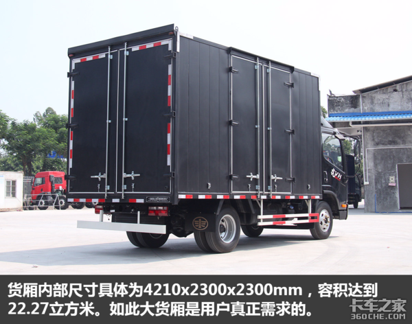 虎VH是宽体车型,驾驶室宽度有2010mm,匹配货厢的宽度可达到2.3米,高度则也有2.3米,货厢内部(4.21x2.3x2.3m)容积约22.3立方米。这大容量的货厢,正是物流公司、货运散户都真正需求的。