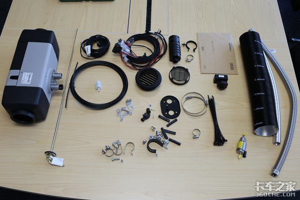 所有的部件摆在桌子上来一个全家福。我们可以看到有加热器主机、油管、线束、风管、各种卡子螺栓、说明书。加热器主机旁边的细长物体是取油器,它可以装在油箱上直接给加热器供油,免去了安装小油箱的烦恼。