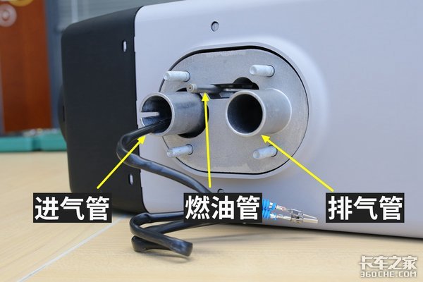 加热器底部的两根粗管道是燃烧室的进排气口,左侧有线缆的是进风口,右侧的则是排风口。中间带有小孔的细管是燃烧室的供油管,油泵泵上来的柴油从这里进入加热器的燃烧室燃烧。