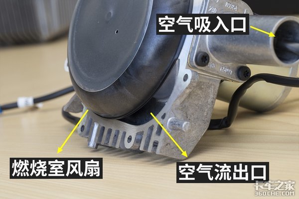 电机和上盖部分一共由三个主要部件组成,最上边的是电动机,它为加热器的循环风扇和燃烧室风扇提供动力;中间是加热器燃烧室的顶盖;底部则是负责向燃烧室提供空气的涡流风扇。