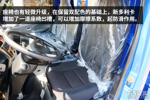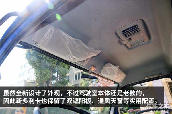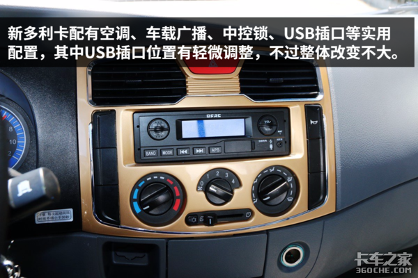 新多利卡依旧延续了老款的功能丰富的特点,除了标配空调和USB插口等实用配置,新多利卡还提供原厂倒车雷达选装,可以减少用户在狭窄地区运输的安全隐患。此外,新车还大量采用了金色面板,好看与否,就看个人喜好了。
