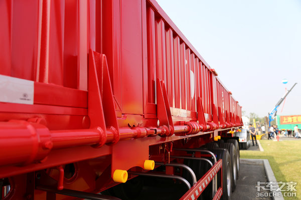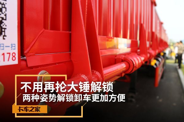 这台挂车最为亮眼的侧翻自动锁,可以在20秒的时间开启和关闭侧翻车厢多个吊门,而且是在驾驶员不下车或者在车尾操作的情况之下。具备安全操作性和缩短了开闭箱板时间,并且可以在旧的侧翻挂车上进行改装增加。