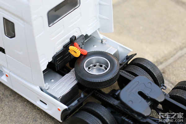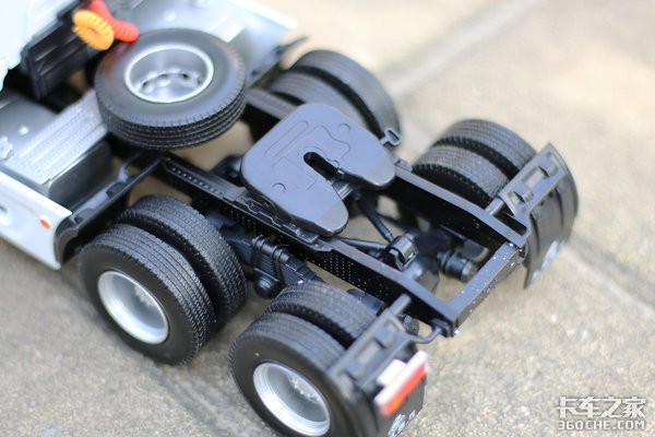 牵引车和挂车的连接管线、备胎、鞍座、V型的推拉杆甚至是轮胎的花纹,这部分细节的还原程度非常高。两个后驱通过中心轴固定在车架之上,也增强了牵引车的驱动能力。后尾灯通过小插销插在分体式的挡泥板上面,为了方便展示,我将一边的取了下来。