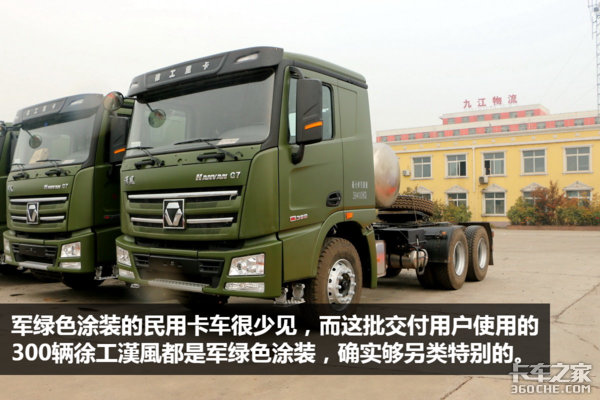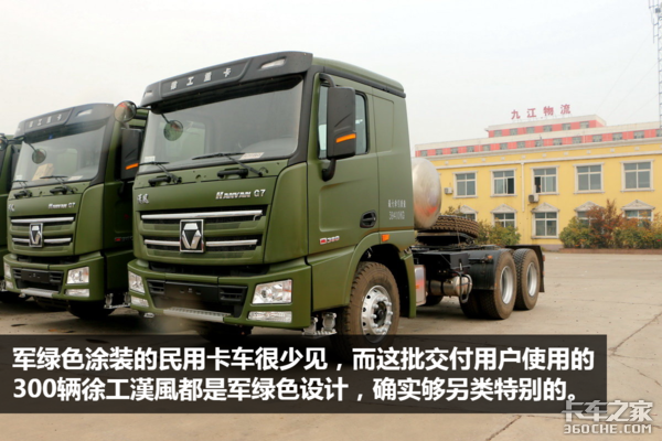 徐工漢風的这款车,颜值上算是中规中矩,无论是车灯还是前面板,跟福田欧曼GTL比较相似。一体式后视镜和工具箱能够让这款车的档次有所提升,军绿色的涂装虽然不够鲜亮,但是却很特殊,让人能够留下比较深的印象。