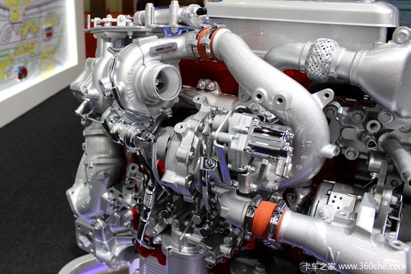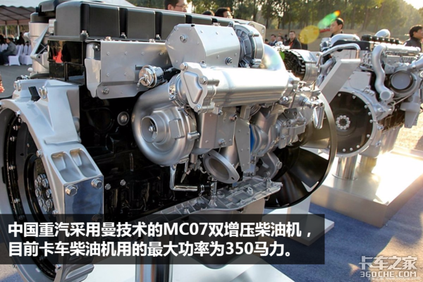 国内最早实现双增压机型装车的,是中国重汽的MC07机型,最大功率达到350马力。应用在重汽T5G、重汽斯太尔等车型上,是重汽轻量化车型的主流动力。