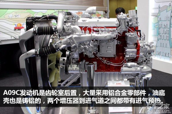 日野J08E的缸径和行程是112x130mm,A09C的缸径和行程是112x150mm,不难看出,A09C是在J08E发动机本体的基础上进行加长行程的扩容产品。排量更大,再加上双增压技术,可以说是如虎添翼。