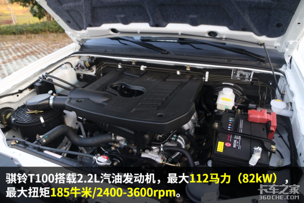骐铃T100搭载的2.2L汽油发动机,最大马力112Ps(82kW),最大扭矩185牛米/2400-3600rpm,匹配的是5挡手动变速箱,采用了前置后驱的形式。