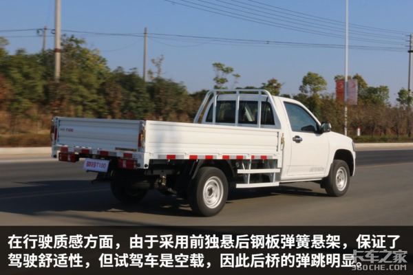 制动部分,刹车踏板偏硬,但好在制动力线性,前段能提供足够的制动力,开起来更加的安心,并且有ABS+EBD的加持,制动更稳定安全。而行驶感受方面,该车采用前独立悬挂后钢板弹簧悬架,具有一定的驾驶舒适性,但试驾车由于是空载,后桥的弹跳确实厉害,车头与车尾呈现截然不同的感觉,相信在载货时,舒适性应该会有所改善。