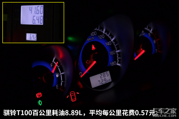 最后统计出来进行油耗测试的这款骐铃T100单排皮卡共耗油6.48升,汽油单价为6.42元/升,共花费41.60元。此次油耗测试的结果为该车百公里耗油8.89L,平均每公里花费0.57元,油耗仅供参考。考虑到全程省道,路况较差并伴随着拥堵路况,容易导致车辆的油耗偏高,如果是正常路况拥堵较少,相信骐铃T100的油耗应该还能再下降。