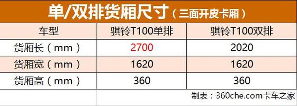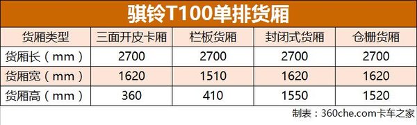这款骐铃T100的三围尺寸为:5665x1720x1740mm,轴距为3480mm,得益于这台车的加长轴距以及单排驾驶室,使其拥有了大货箱,货箱长度达2700mm,内宽为1620mm,栏板高360mm。