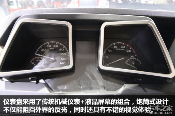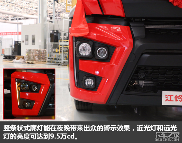 说到大灯,江铃威龙这套散发着凶猛眼神的组合式大灯可不是一个样子货。左右两侧的竖条状式廓灯能在夜晚带来出众的警示效果。近光灯和远光灯的亮度更是可以达到9.5万cd(普通重型车大灯亮度为8万~8.2万cd),完全没有在后期改装氙气灯的必要。