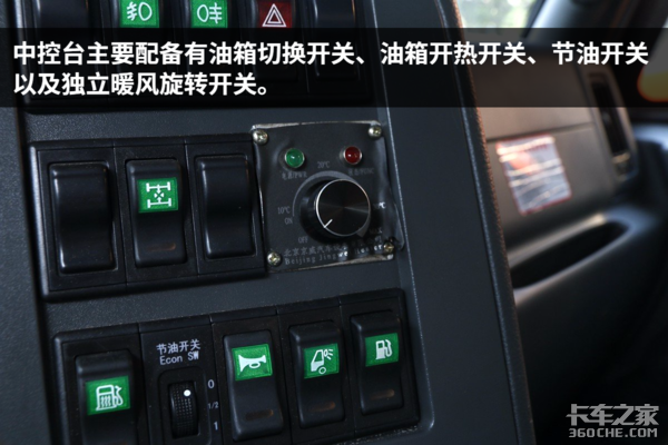 寒区版比普通版多了很多配置,一些开关布置在中控台上,方便司机随时控制。比如该车带有油箱加热功能、油箱切换开关,以及独立暖风开关。据说独立暖风最高温度可控制在30度以内,关掉发动机也可独立运转,那么司机在夜间休息下开启暖风也不会那么冷了。