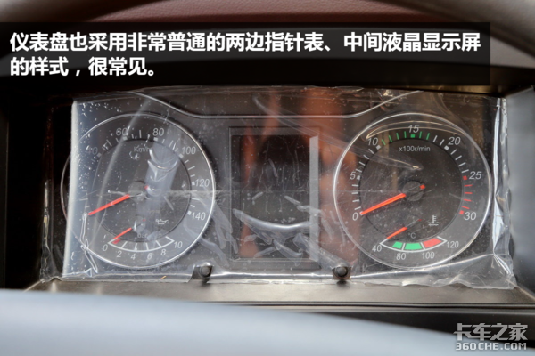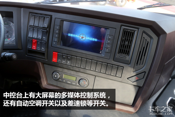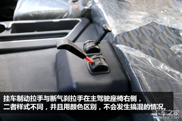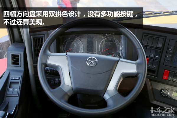 ● 内饰点评:大运N8V的驾驶室内部相对比较比较中规中矩,没什么特别大的亮点,各部分面板、方向盘等部件的做工也不够精细,挑不出毛病,却也看不出优点,不过挂车制动拉手和断气刹拉手的区别、220V电源插口等细节做得还是挺不错的。