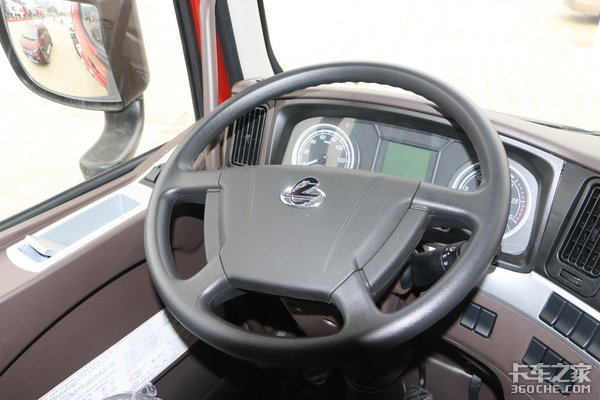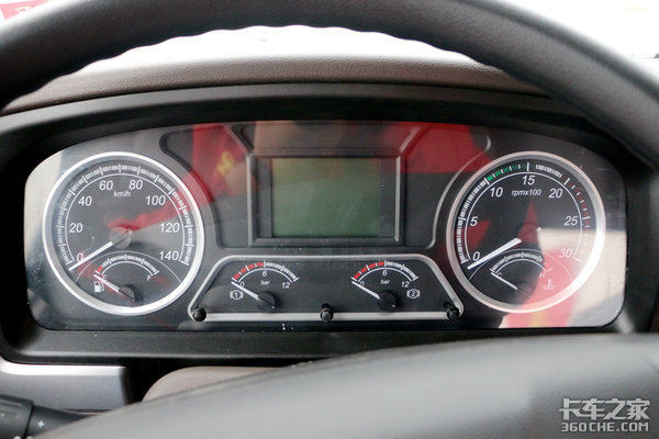 仪表盘与大多数卡车差不多,也采用指针与液晶显示屏结合的布局方式,车速表、转速表、油量表、水温表以及气压表清晰易读,其他的指示灯以及行车过程中的车辆数据显示都在中间的显示屏区域。