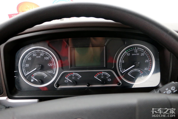 仪表盘尺寸比较大,六个指示表相当清晰,左侧是车速表和燃油表,右侧是转速表和水温表,中间下方两个表是气压表,中间则是液晶单色显示屏,行车数据、信息都在这里显示。