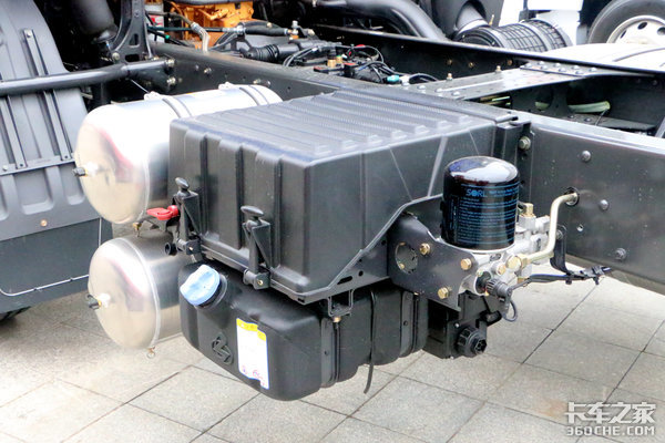 储气罐、电瓶、尿素罐、空气处理单元都集中布置在车架左侧,设计比较巧妙,尿素罐采用横置在电瓶下方的方式,而且这样的设计在乘龙H7、新M3上均能见到,属于模块化设计。