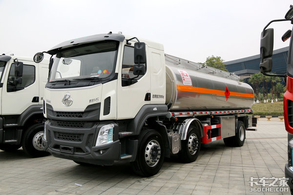 说完了乘龙H5的工程专用车,最后来看一款乘龙H5危化运输专用车。这是一台低顶小三桥乘龙H5柴油槽罐运输车,因为是危化品运输车型,所以在车辆的排气装置都改成了前置。