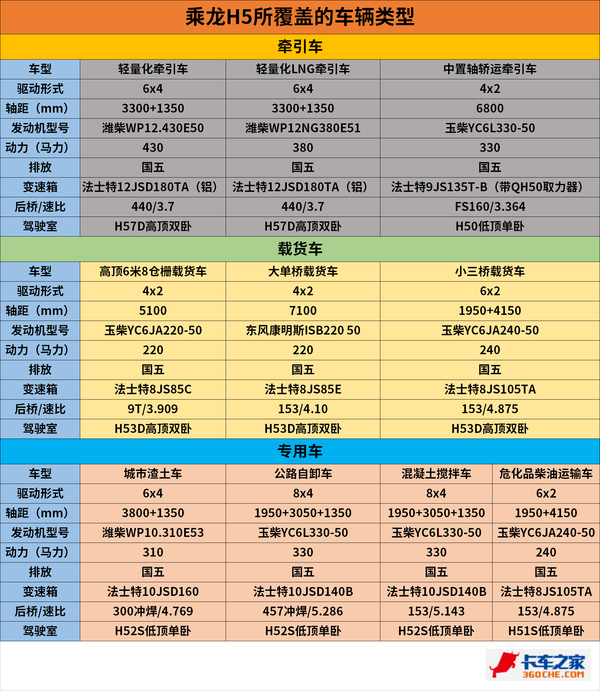 【卡车之家 原创】说起乘龙H5,相信大家并不陌生,从11月初武汉国际商用车展上震撼亮相一直到现在,乘龙H5的关注度持续不减,375马力的6x4牵引车自重仅7.5吨,着实吸引了不少用户的眼球。其实,乘龙H5除了超级轻量化牵引车,在其他运输环境要求下也有对应的车型。