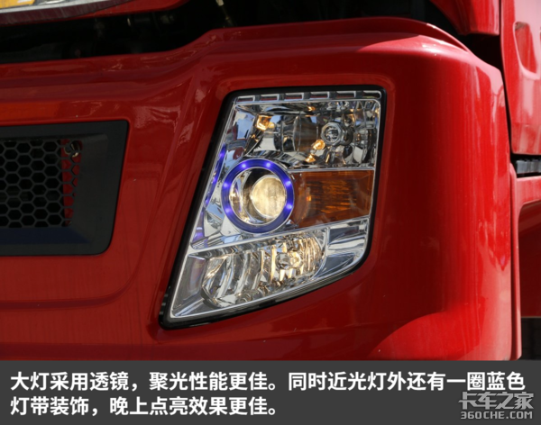红岩杰豹牵引车在外观上继承红岩品牌车型的设计风格,拥有较高的可辨识度,同时在设计造型上也十分的大气。值得一提的是大灯的设计,近光灯采用聚光更好的透镜,同时配有蓝色灯圈效果也更炫目。