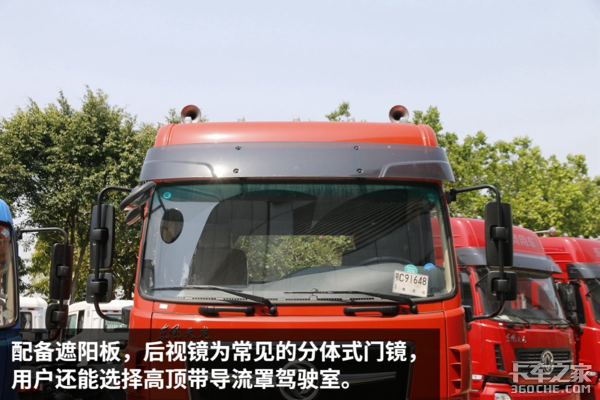 这款东风天龙采用的是新款天锦驾驶室,在外观方面与现款天锦牵引车并无太大区别,主要是细节上进行了优化,譬如在保险杠上设置了蹬车踏板、车顶加入遮阳板以及优化了轮眉设计。