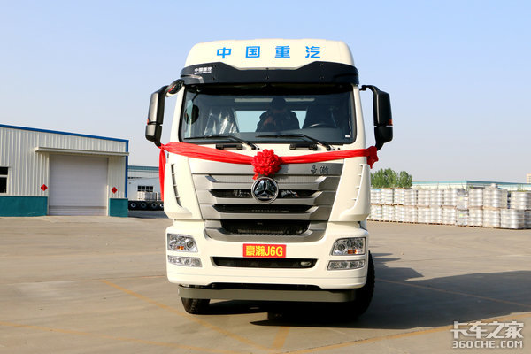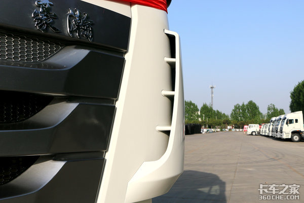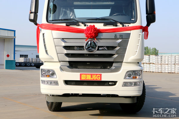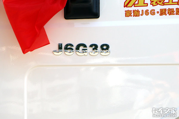 车门标识表示车辆型号为豪瀚J6G,“38”则表示这款车的动力为380马力,380马力的8x4载货车,可以说动力非常充沛了,基本上可以胜任国内各种各样的运输工况。