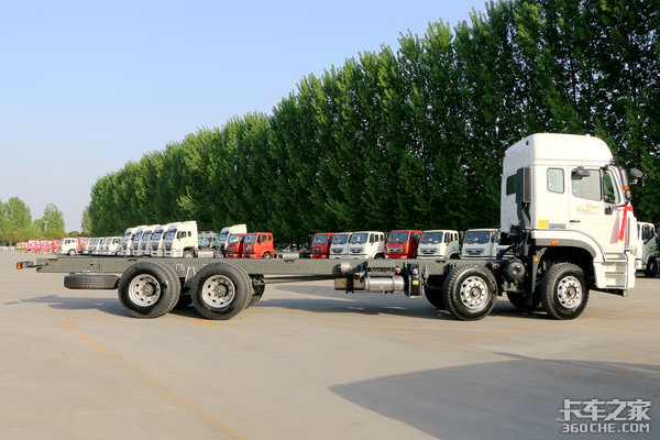 今天介绍的这款豪瀚J6G质轻版载货车采用8x4驱动形式,总长12米,可以上装9.6米的栏板、仓栅、封闭厢或者冷藏等车厢。从外观上来看,就是一款非常标准的9米6前四后八载货车底盘。