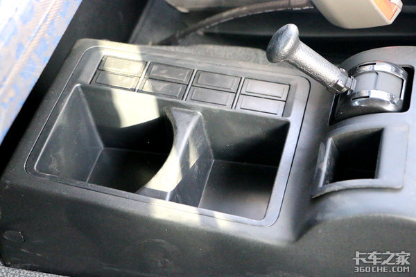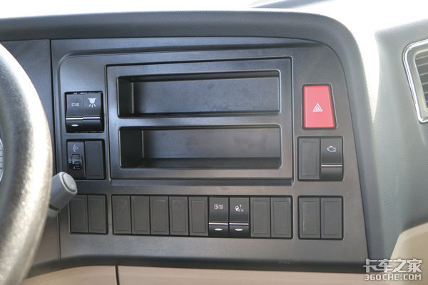 这款车是标准版车型,没有配备大屏幕的多媒体导航系统,中控中间是两个比较深的储物槽,防止卡片、手机之类的物品非常放那边,下面有两个按键是油箱加热和驾驶室翻转开关,右边是危险报警灯、发动机自检开关。